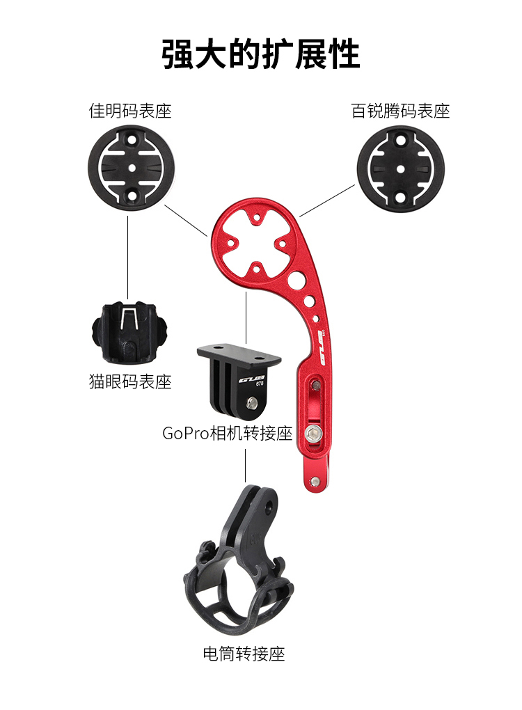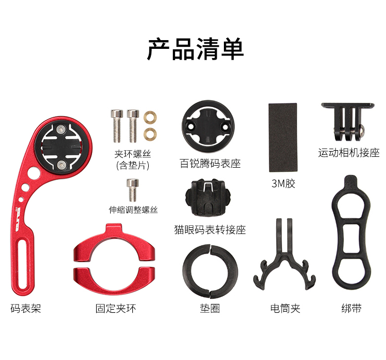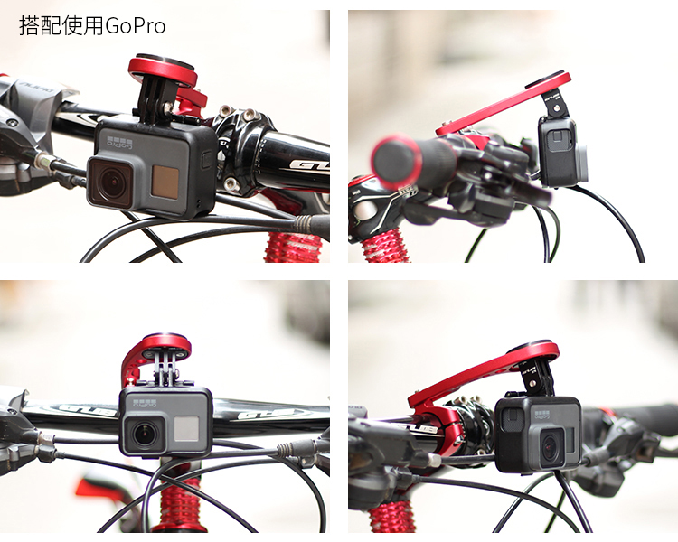 安裝在車把上,可伸縮設(shè)計(jì),兼容佳明碼表,使用附帶的配件可兼容百銳騰碼表、貓眼碼表,另標(biāo)配運(yùn)動(dòng)相機(jī)轉(zhuǎn)接頭和電筒轉(zhuǎn)接頭。