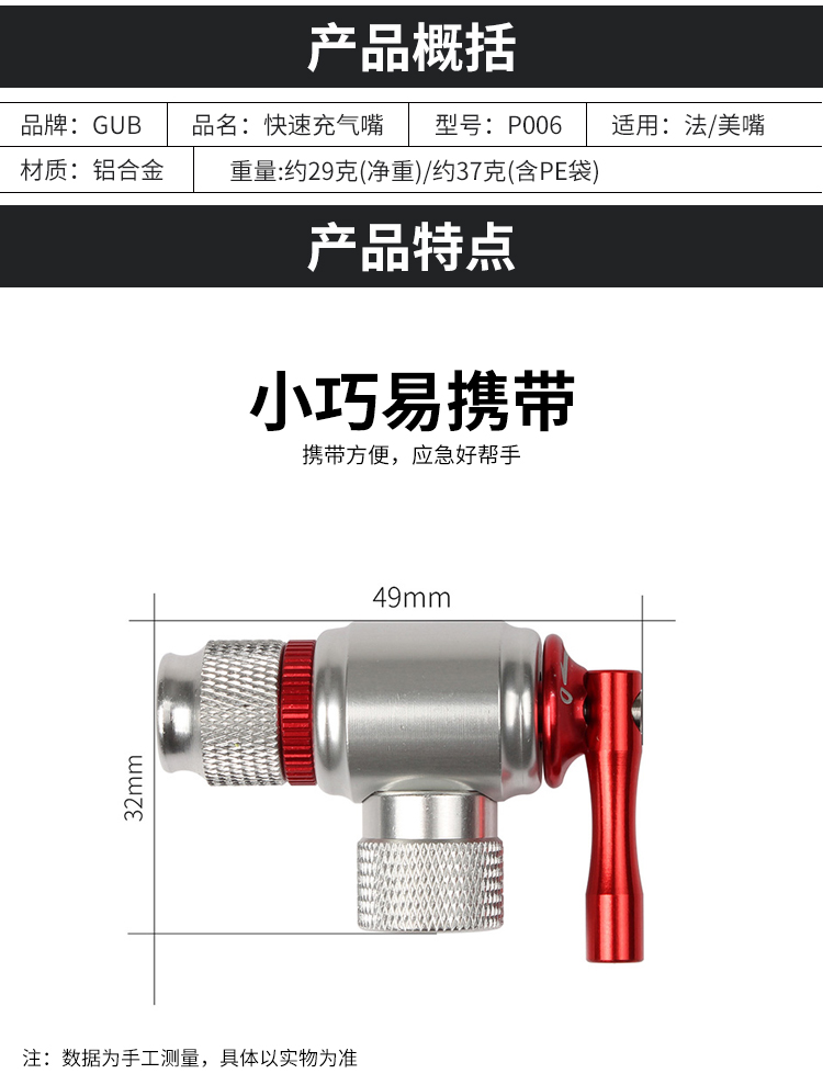 名稱:GUB P006 快速充氣嘴 功能:充氣氣嘴 材質(zhì):鋁合金 適用:法/美嘴 重量:約29克(凈重)/約37克(毛重) 統(tǒng)一零售價:108元