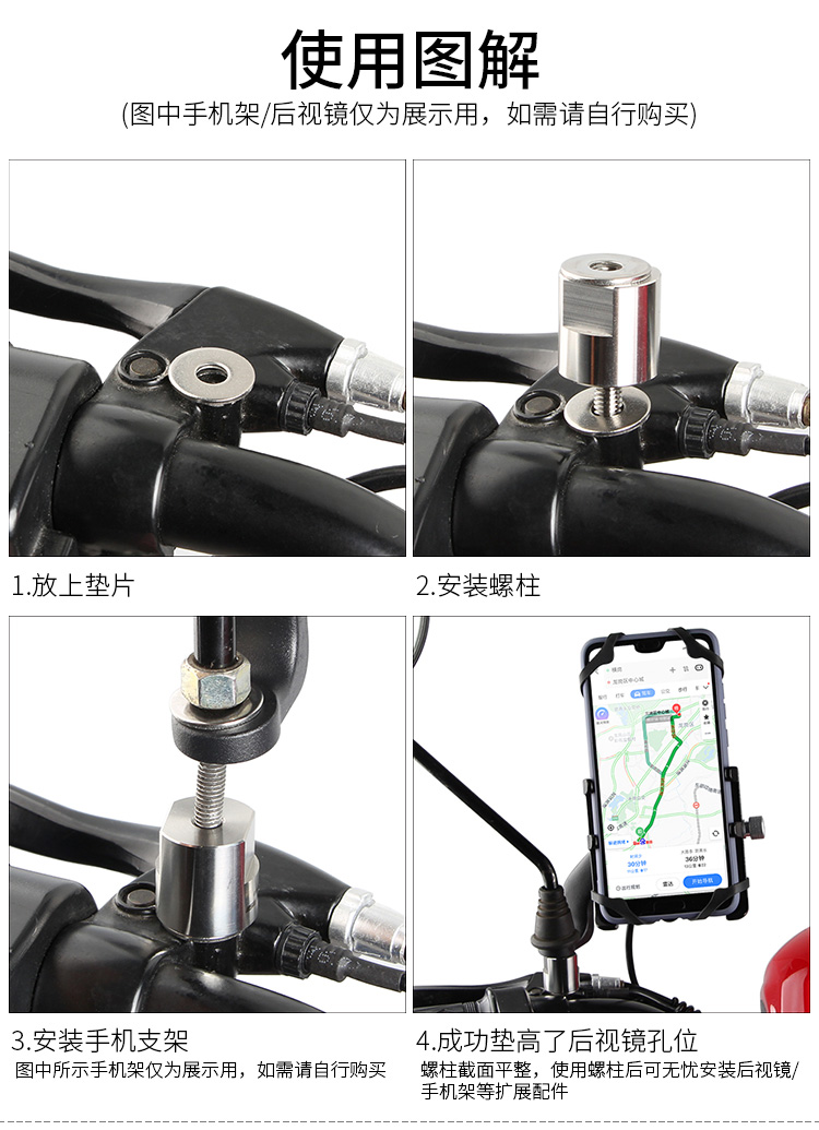 簡(jiǎn)介:此配件為后視鏡輔助配件,采用不銹鋼材質(zhì),耐用不生銹,用于摩托車(chē)/電動(dòng)車(chē)后視鏡孔位的擴(kuò)展,起到墊高或更好適配的作用。