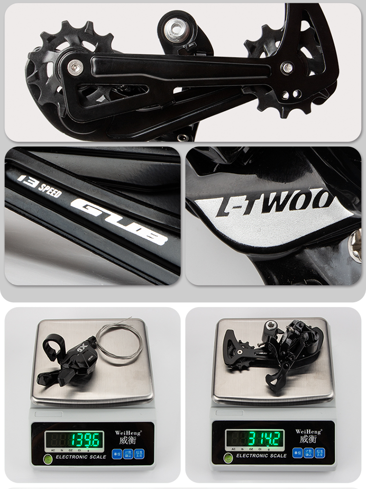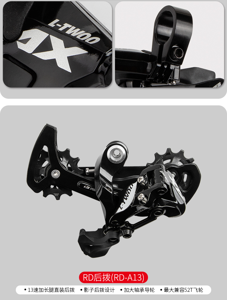 后撥:13速加長(zhǎng)腿直裝后撥,影子后撥設(shè)計(jì),加大軸承導(dǎo)輪,最大兼容52T飛輪