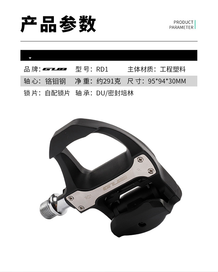 名稱:GUB RD1 公路車自鎖鎖踏 適用類型:公路車 材質:工程塑料+鉻鉬鋼軸心 重量:凈重約291克/對、毛重約462克 統(tǒng)一零售價:158元