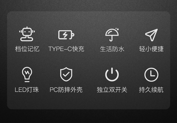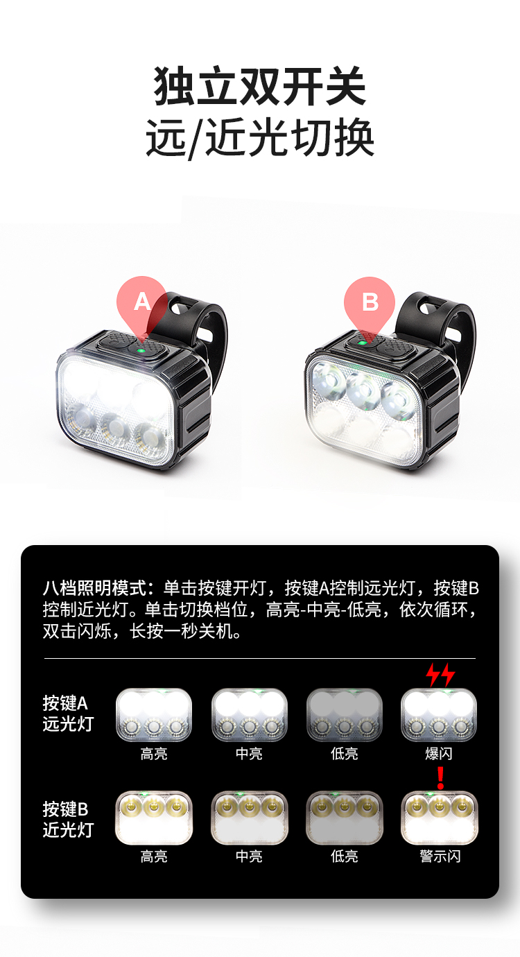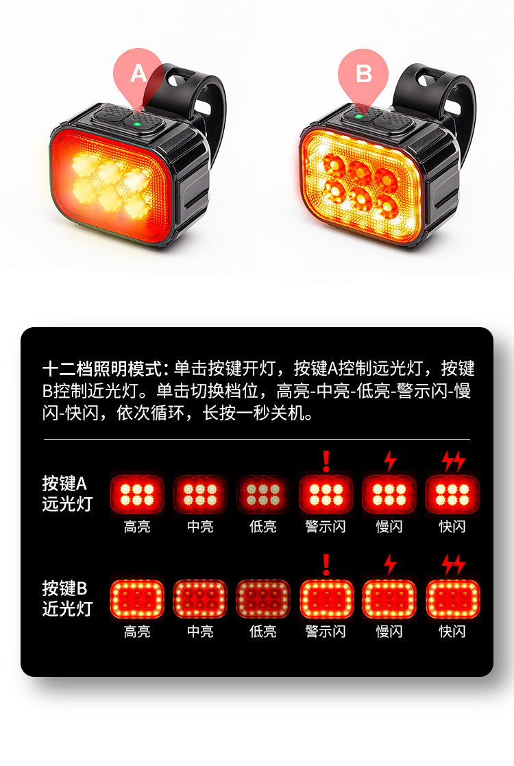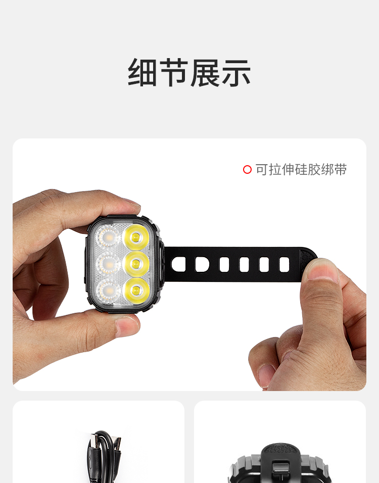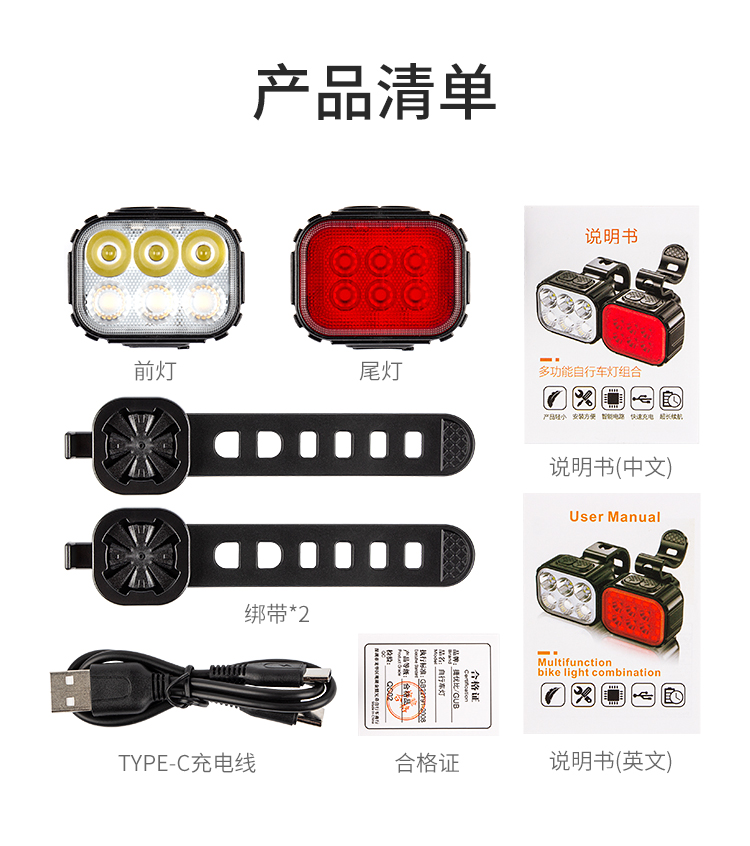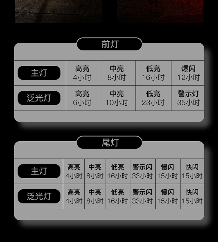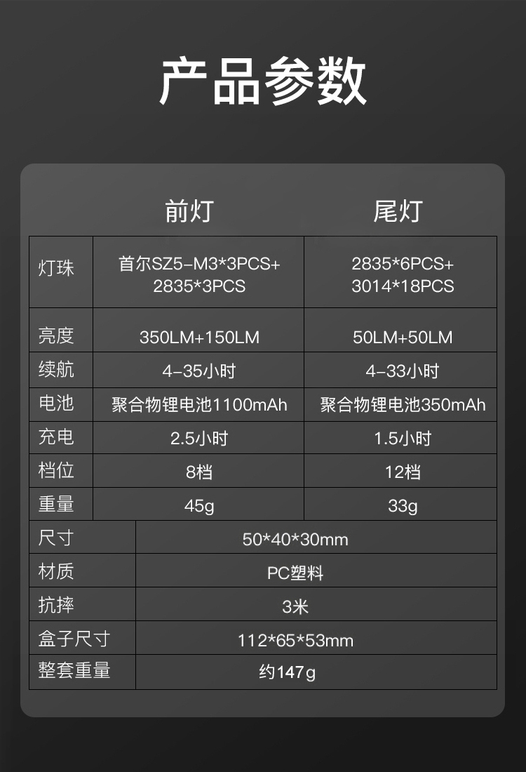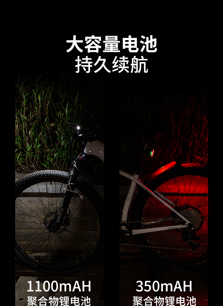 電池:聚合物鋰電池,1100mAH(前燈)、350mAH(尾燈)