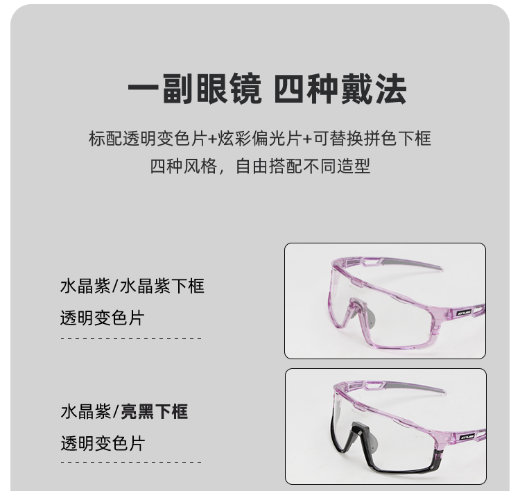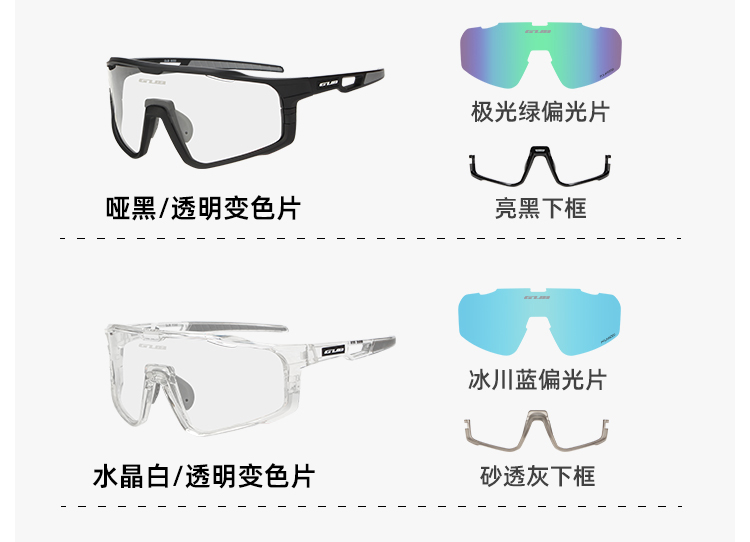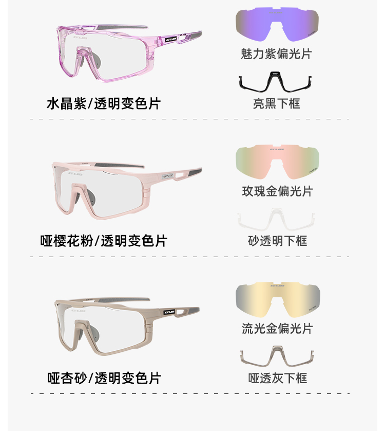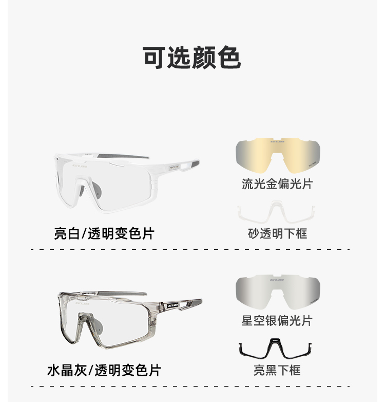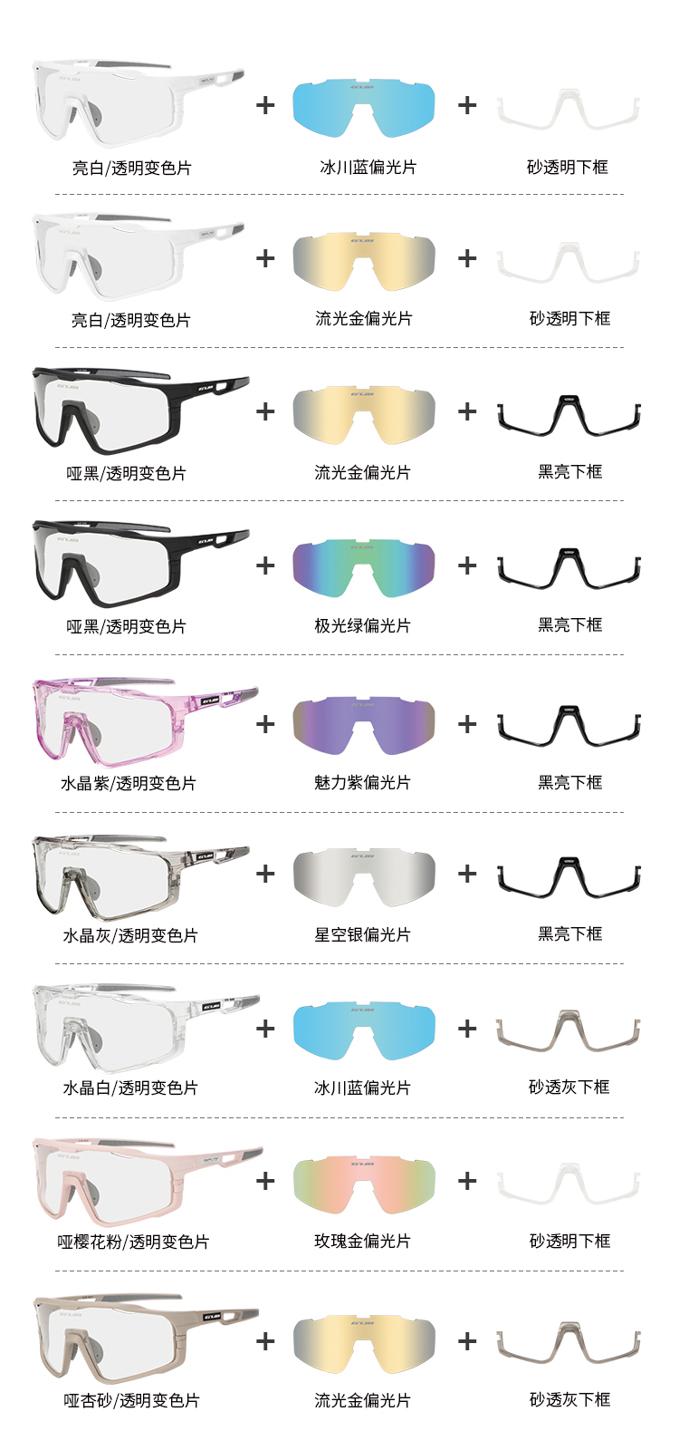 顏色:亮白/透明變色片(冰川藍(lán)偏光片)、亮白/透明變色片(流光金偏光片)、啞黑/透明變色片(極光綠偏光片)、啞黑/透明變色片(流光金偏光片)、水晶紫/透明變色片(魅力紫偏光片)、水晶灰/透明變色片(星空銀偏光片)、水晶白/透明變色片(冰川藍(lán)偏光片)、啞櫻花粉/透明變色片(玫瑰金偏光片)、啞杏砂/透明變色片(流光金偏光片)