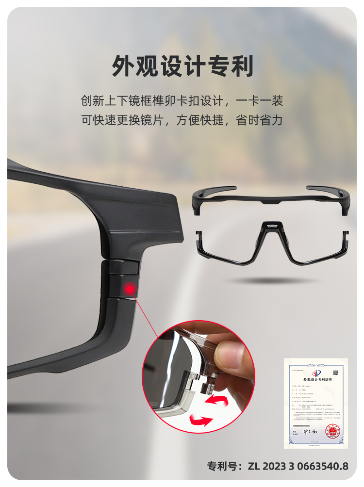 特點(diǎn):標(biāo)配透明變色片,另贈(zèng)送一副偏光鏡片和下框,一副眼鏡,四種顏色搭配,滿足個(gè)性需求。專(zhuān)利設(shè)計(jì)上下可拆卸框,快速更換鏡片。