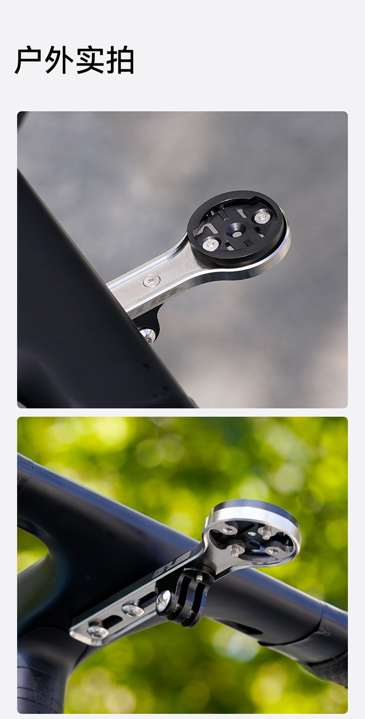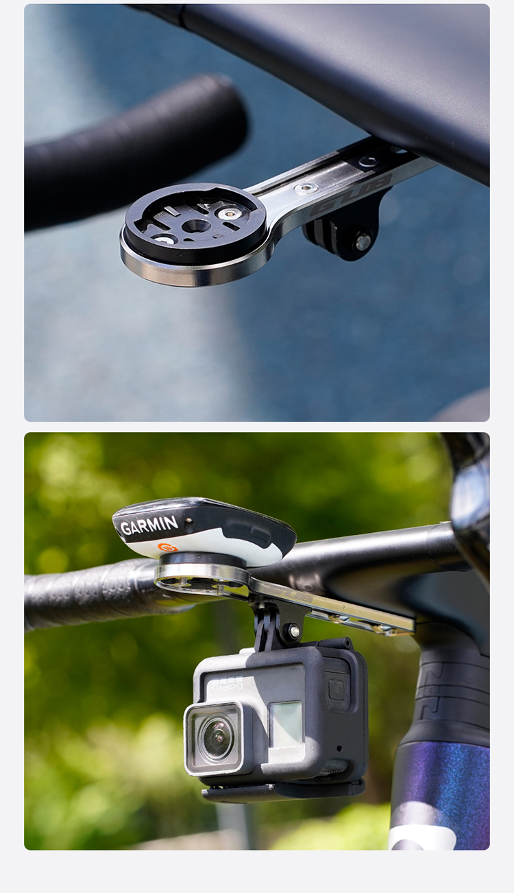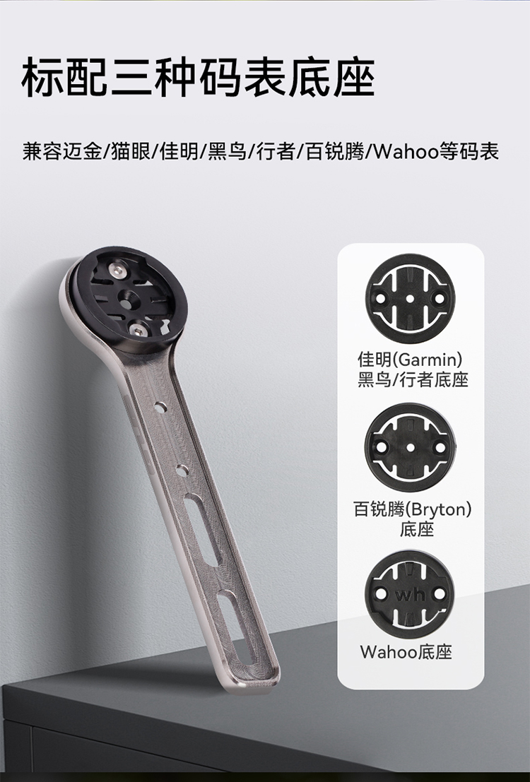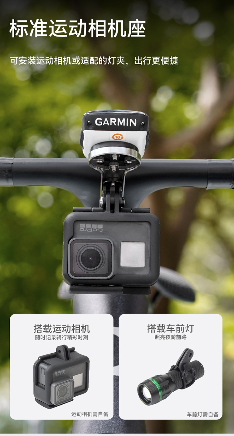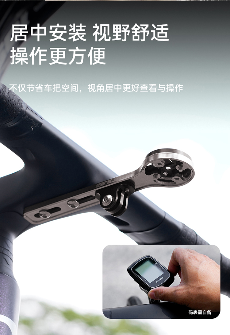 特點:鈦合金超輕架體,居中安裝節(jié)省空間(一體把專用),兼容多種碼表,標配運動相機轉(zhuǎn)接座,可擴展使用運動相機等配件