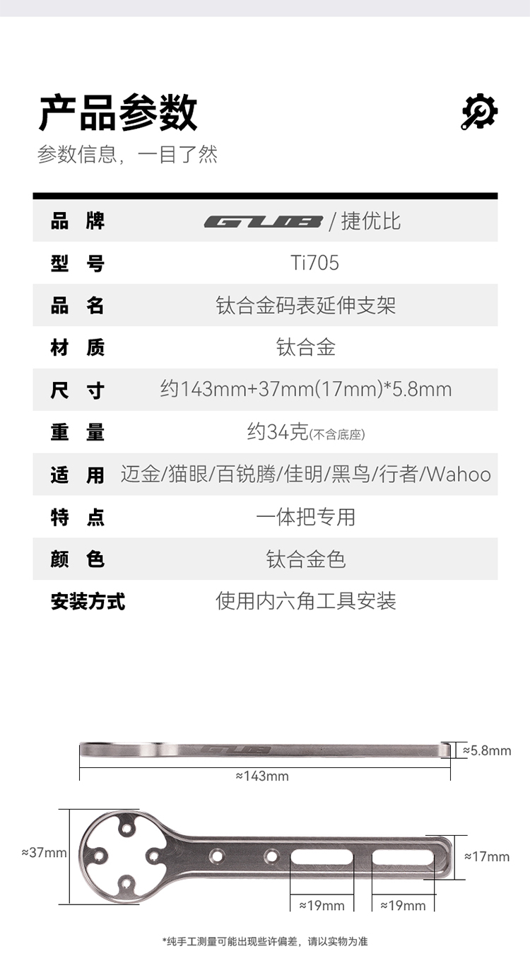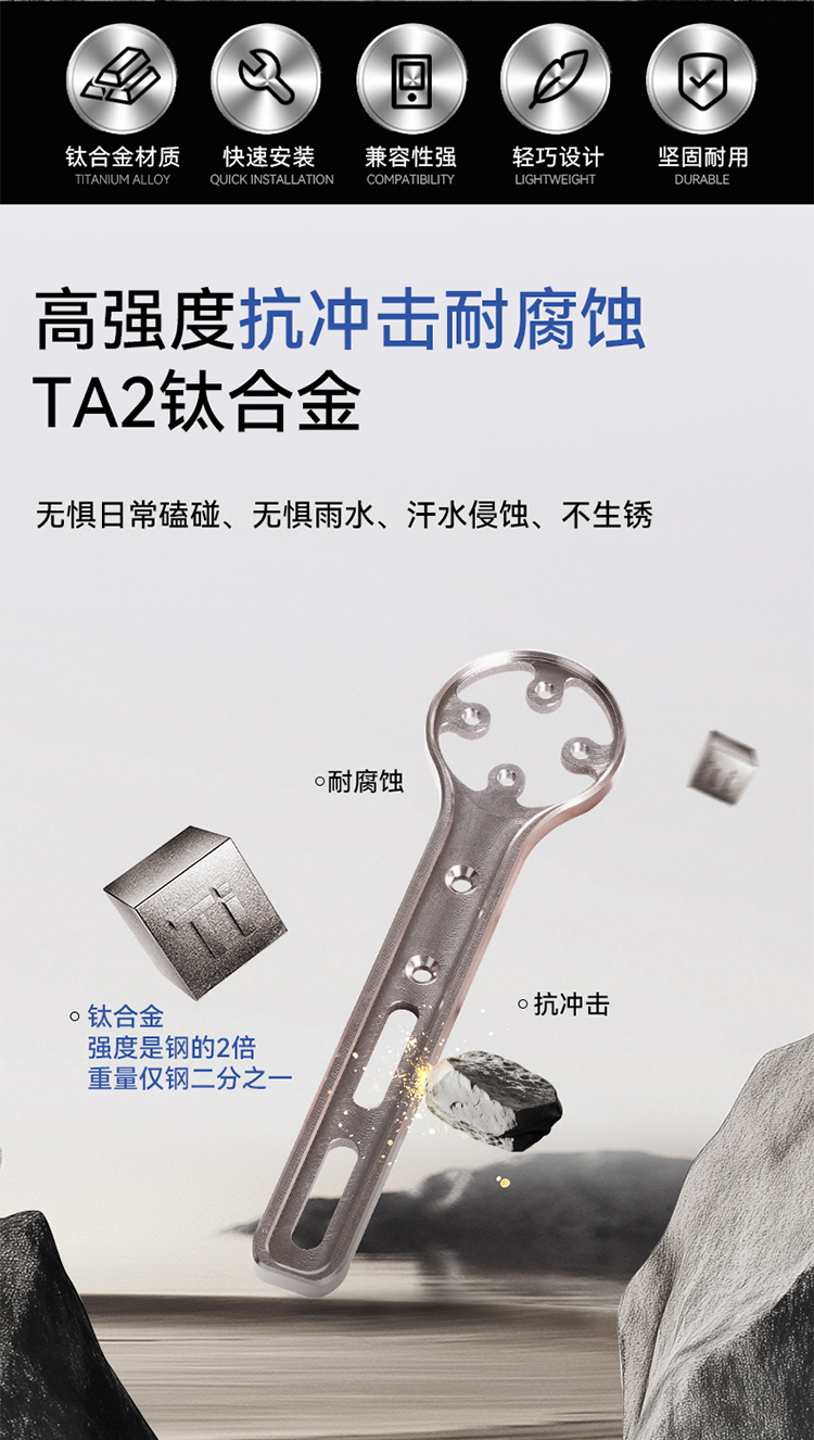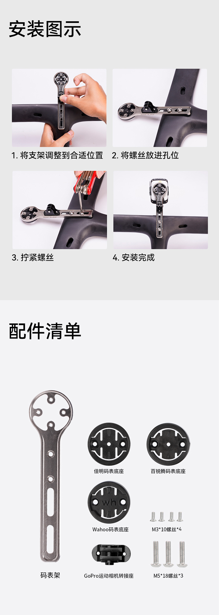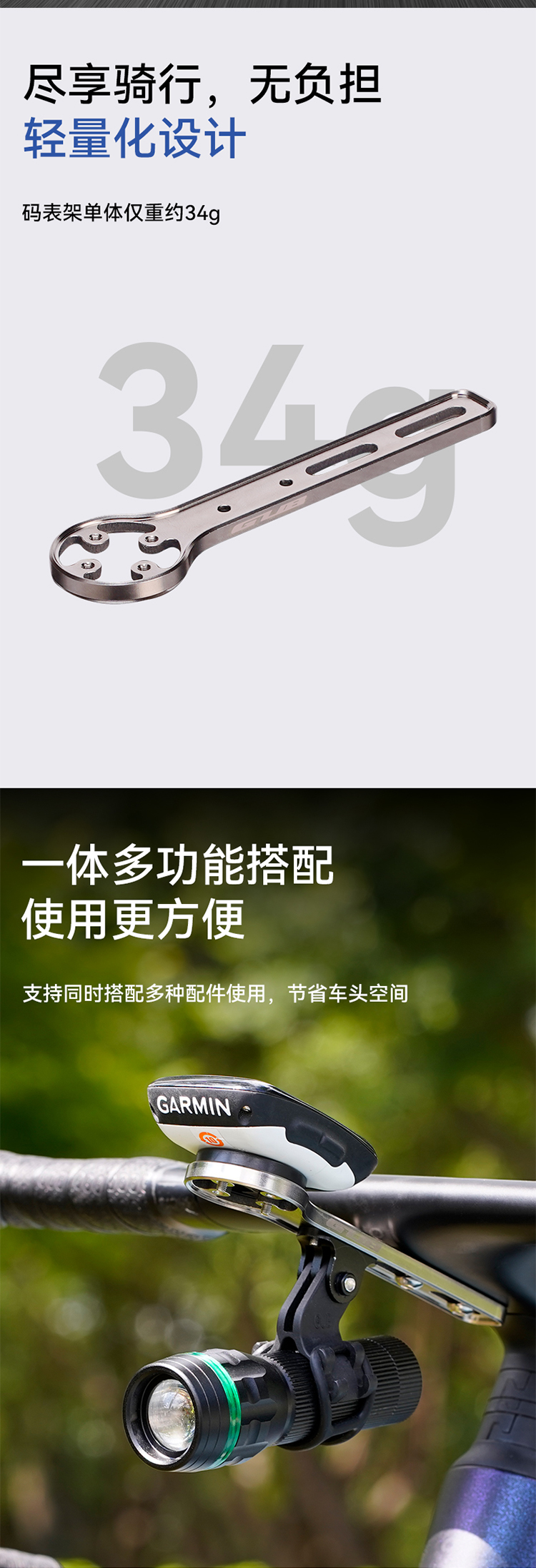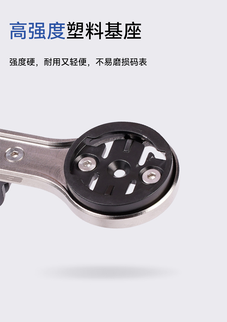 特點:鈦合金超輕架體,居中安裝節(jié)省空間(一體把專用),兼容多種碼表,標配運動相機轉(zhuǎn)接座,可擴展使用運動相機等配件